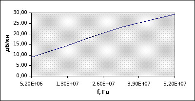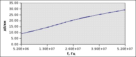 Рис. 7.4. Частотная зависимость коэффициента затухания, a дБ/км. Коэффициент фазы b с ростом частоты возрастает почти по прямолинейному закону.