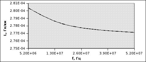 Рис. 7.2. Частотная зависимость индуктивности коаксиальной цепи. Емкость коаксиальной цепи от частоты не зависит. Проводимость изоляции с ростом частоты линейно возрастает. Величина ее зависит в первую очередь от качества диэлектрика, используемого в кабеле и характеризуется величиной угла диэлектрических потерь tgd. Частотная зависимость проводимости изоляции показана на рис. 7.3.