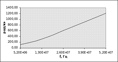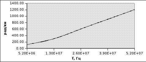Рис. 7.5. Частотная зависимость коэффициента фазы b, рад/км. Частотная зависимость волнового сопротивления коаксиальной цепи иллюстрируется графиком на рис. 7.6. Модуль волнового сопротивления с увеличением частоты уменьшается.