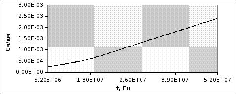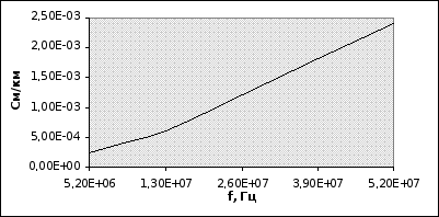 Рис. 7.3. Частотная зависимость проводимости изоляции коаксиальной цепи. На рис. 7.4 показана частотная зависимость коэффициента затухания. С ростом частоты коэффициент затухания возрастает.