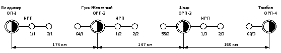 Построим схему размещения РП на магистрали с нумерацией всех РП. Нумерация ОРП ведется: от административного центра высшего назначения к административному центру низшего назначения, на магистралях, соединяющих административные центры одинакового значения, с севера на юг. В нашем случае нумерация ОРП ведется от Владимира к Тамбову. Размещение регенерационных пунктов на магистрали представлено на рис. 8.1.