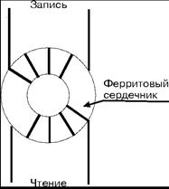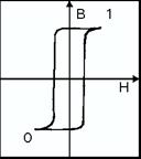 Энергонезависимая память позволяла хранить введенные в нее данные продолжительное время (до одного месяца) при отключении питания. Чаще всего в качестве энергонезависимой памяти использовались ферритовые сердечники. Они представляют собой тор, изготовленных из специальных материалов — ферритов. Ферриты характеризуются тем, что петля гистерезиса зависимости их намагниченности от внешнего магнитного пол носит практически прямоугольный характер. Рис. B.1. Диаграмма намагниченности ферритов.