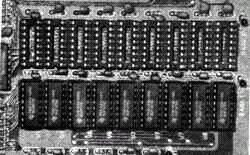 Рис. B.3.2. Банк модулей памяти DIP Микросхемы (по-другому, чипы) динамического ОЗУ устанавливаются так называемыми банками. Банки бывают на 64, 256 Кбайт, 1 и 4 Мбайт. Каждый банк состоит из девяти отдельных одинаковых чипов. Из них восемь чипов предназначены для хранени информации, а девятый чип служит для проверки четности остальных восьми микросхем этого банка. Чипы памяти бывают одно и четырехразрядными, и иметь емкость 64 Кбит, 256 Кбит, 1 и 4 Мбит. Обозначение разновидностей микросхем памяти в DIP-корпусах показано в таблице [Р. Вебер, стр. 46—].