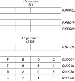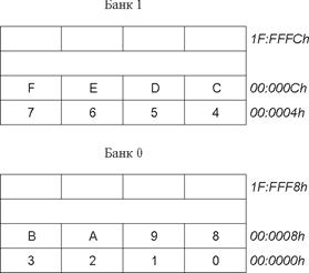Для старых персональных компьютеров (на основе микропроцессоров Intel i8088, i8086, i80286 и процессоре i80386/20 МГц) была характерна одноуровневая система организации памяти. По этой системе разработчики были вынуждены устанавливать дешевые DRAM с быстродействием 80 —120 нс, либо применять дорогостоящие SRAM с быстродействием 40 —60 нс. Для сокращени среднего времени ожидания при обращении к операционной системе использовались (и используются в настоящее время) методы интерливинга и страничной организации. Рис. B.4.1. Система с интерливингом памяти. В системе с интерливингом —расслоением адресов ячеек памяти —весь объем памяти делится на два или несколько банков. Двойные слова с последовательными адресами располагаются в разных банках. Во время считывания информации из оперативной памяти за один цикл можно организовать параллельное извлечение информации из разных блоков, что уменьшает количество циклов ожидания.