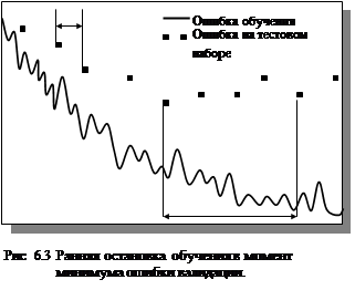 Использование этой методики в работе с сейсмическими данными затруднено тем обстоятельством, что исходная выборка очень мала, а хотелось бы как можно больше данных использовать для обучения сети. В связи с этим было принято решение отказаться от формирования валидационного множества, а в качестве момента остановки алгоритма обучения использовать следующее условие: ошибка обучения достигает заданного минимального уровня, причем значение минимума устанавливается немного большим чем обычно. Для проверки этого условия проводились дополнительные эксперименты, показавшие что при определенном минимуме ошибки обучения достигался относительный минимум ошибки на тестовых данных. Два других подхода для контроля переобучения предусматривают постепенное изменение структуры сети. Только в одном случае происходит эффективное вымывание малых весов (weight elimination) ,т.е. прореживание малозначительных связей, а во втором, напротив, поэтапное наращивание сложности сети. [3,4,5]. 6.6 Формирование обучающей выборки и оценка эффективности обученной нейросетевой модели. Из исходных данных необходимо сформировать как минимум две выборки – обучающую и проверочную. Обучающая выборка нужна для алгоритма настройки весовых коэффициентов, а наличие проверочной, тестовой выборки нужно для оценки эффективности обученной нейронной сети. Как правило, используют следующую методику: из всей совокупности данных случайным образом выбирают около 90% векторов для обучения, а на оставшихся 10% тестируют сеть. Однако, в условиях малого количества примеров эта процедура становится неэффективной с точки зрения оценивания вероятности ошибки классификации. В разделе 4.4 был описан другой, наиболее точный метод расчета ошибки классификации. Это, так называемый, метод скользящего экзамена (синонимы: cross-validation, “plug-in”-метод).[7,9]. В терминах нейронных сетей основную идею метода можно выразить так: выбирается один вектор из всей совокупности данных, а остальные используются для обучения НС. Далее, когда процесс обучения будет завершен, предъявляется этот выбранный вектор и проверяется правильно сеть распознала его или нет. После проверки выбранный вектор возвращается в исходную выборку. Затем выбирается другой вектор, на оставшихся сеть вновь обучается, и этот новый вектор тестируется. Так повторяется ровно n1+n2 раз, где n1–количество векторов первого класса, а n2 - второго. По завершению алгоритма общая вероятность ошибки P подсчитывается следующим образом: