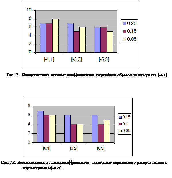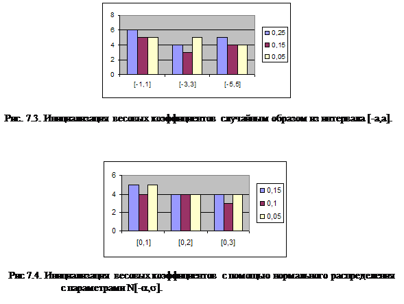 6.4 Выбор начальных весовых коэффициентов. Перед тем, как приступить к обучению нейронной сети, необходимо задать ее начальное состояние. От того насколько удачно будут выбраны начальные значения весовых коэффициентов зависит, как долго сеть за счет обучения и подстройки будет искать их оптимальное величины и найдет ли она их. Как правило, всем весам на этом этапе присваиваются случайные величины равномерно распределенные в диапазоне [-A,A], например [-1,1], или [-3,3]. Однако, как показали эксперименты, данное решение не является наилучшим и в качестве альтернативы предлагается использовать другие виды начальной инициализации, а именно: 1. Присваивать весам случайные величины, заданные не равномерным распределением, а нормальным распределением с параметрами N[a,s], где выборочное среднее a=0, а дисперсия s = 2, или любой другой небольшой положительной величине. Для формирования нормально распределенной величины можно использовать следующий алгоритм: Шаг 1. Задать 12 случайных чисел x1, x2, …,x12 равномерно распределенных в диапазоне [0,1]. xi Í R[0,1]. Шаг 2. Для