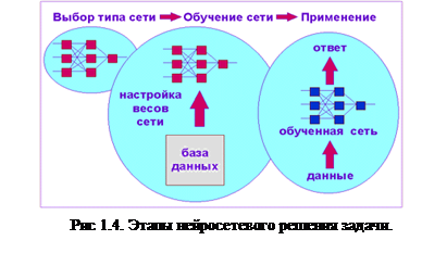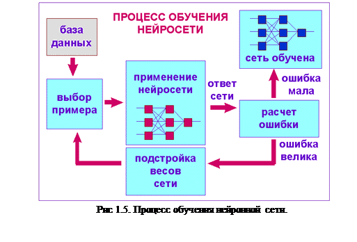 адаптированную для решения поставленной задачи?". Этот вопрос решается в два этапа: (рис. 1.4) 1. Выбор типа (архитектуры) сети 2. Подбор весов (обучение) сети. На первом этапе следует выбрать следующее: · какие нейроны мы хотим использовать (число входов, передаточные функции); · каким образом следует соединить их между собой; · что взять в качестве входов и выходов сети. Эта задача на первый взгляд кажется необозримой, но, к счастью, необязательно придумывать нейросеть "с нуля" - существует несколько десятков различных нейросетевых архитектур, причем эффективность многих из них доказана математически. Наиболее популярные и изученные архитектуры - это многослойный персептрон, нейросеть с общей регрессией, сети Кохонена и другие. На втором этапе следует "обучить" выбранную сеть, то есть подобрать такие значения ее весов, чтобы сеть работала нужным образом. Необученная сеть подобна ребенку - ее можно научить чему угодно. В используемых на практике нейросетях количество весов может составлять несколько десятков тысяч, поэтому обучение - действительно сложный процесс. Для многих архитектур разработаны специальные алгоритмы обучения, которые позволяют настроить веса сети определенным образом. Обучение нейросети. Обучить нейросеть - значит, сообщить ей, чего мы от нее добиваемся. Этот процесс очень похож на обучение ребенка алфавиту. Показав ребенку изображение буквы "А", мы спрашиваем его: "Какая это буква?" Если ответ неверен, мы сообщаем ребенку тот ответ, который мы хотели бы от него получить: "Это буква А". Ребенок запоминает этот пример вместе с верным ответом, то есть в его памяти происходят некоторые изменения в нужном направлении. Мы будем повторять процесс предъявления букв снова и снова до тех пор, когда все 33 буквы будут твердо запомнены. Такой процесс называют "обучение с учителем". При обучении сети мы действуем совершенно аналогично. Пусть у нас имеется некоторая база данных, содержащая примеры из разных классов, которые необходимо научиться распознавать (набор рукописных изображений букв). Предъявляя изображение буквы "А" на вход сети, мы получаем от нее некоторый ответ, не обязательно верный. Нам известен и верный (желаемый) ответ - в данном случае нам хотелось бы, чтобы на выходе с меткой "А" уровень сигнала был максимален. Обычно в качестве желаемого выхода в задаче классификации берут набор (1,0,0,...), где 1 стоит на выходе с меткой "А", а 0 - на всех остальных выходах. Вычисляя разность между желаемым ответом и реальным ответом сети, мы получаем 33 числа - вектор ошибки. Далее применяя различные алгоритмы по вектору ошибки вычисляем требуемые поправки для весов сети. Одну и ту же букву (а также различные изображения одной и той же буквы) мы можем предъявлять сети много раз. В этом смысле обучение скорее напоминает повторение упражнений в спорте - тренировку. Оказывается, что после многократного предъявления примеров веса сети стабилизируются, причем сеть дает правильные ответы на все (или почти все) примеры из базы данных. В таком случае говорят, что "сеть выучила все примеры", " сеть обучена", или "сеть натренирована". В программных реализациях можно видеть, что в процессе обучения величина ошибки (сумма квадратов ошибок по всем выходам) постепенно уменьшается. Когда величина ошибки достигает нуля или приемлемого малого уровня, трен