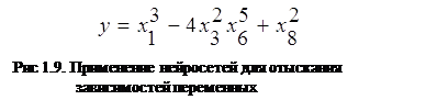 экономических показателей, сложным образом связанных между собой. Кластеризацию и поиск закономерностей. Помимо задач классификации, нейросети широко используются для поиска зависимостей в данных и кластеризации. Например, нейросеть на основе методики МГУА (метод группового учета аргументов) позволяет на основе обучающей выборки построить зависимость одного параметра от других в виде полинома (рис. 1.9). Такая сеть может не только мгновенно выучить таблицу умножения, но и найти сложные скрытые зависимости в данных (например, финансовых), которые не обнаруживаются стандартными статистическими методами.