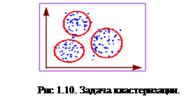 Кластеризация - это разбиение набора примеров на несколько компактных областей (кластеров), причем число кластеров заранее неизвестно (рис. 1.10). Кластеризация позволяет представить неоднородные данные в более наглядном виде и использовать далее для исследования каждого кластера различные методы. Например, таким образом можно быстро выявить фальсифицированные страховые случаи или недобросовестные предприятия.