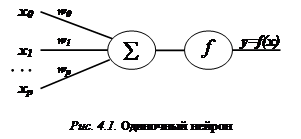 где 3.4 Оценка вероятности ошибочной классификации методом скользящего экзамена. Оценивание вероятности ошибочной идентификации типа событий (землетрясение-взрыв), в каждом конкретном регионе представляет собой одну из основных практических задач мониторинга. Эту задачу приходится решать на основании накопления региональных сейсмограмм событий, о которых доподлинно известно, что они порождены землетрясениями или взрывами. Эти же сейсмограммы представляют собой "обучающие данные" для адаптации решающих правил. Из теории распознавания образов известно, что наиболее точной и универсальной оценкой вероятности ошибок классификации является оценка, обеспечиваемая процедурой “скользящего экзамена”(“cross-validation”) [11]. В методе скользящего экзамена на каждом шаге один из обучающих векторов xsj , jÎ1,ns, sÎ1,2, исключается из обучающей выборки. Оставшиеся векторы используются для адаптации (обучения) LDF или QDF или любого другого дискриминатора. Исключенный вектор затем классифицируется с помощью дискриминатора, обученного без его участия. Если этот вектор классифицируется неправильно, т.е. относится к классу 2 вместо класса 1 или наоборот, соответствующие “счетчики” n12 или n21 увеличиваются на 1. Исключенный вектор затем возвращается в обучающую выборку, а изымается уже другой вектор xs(j+1). Процедура повторяется для всех nl +n2 обучающих векторов. Вычисляемая в результате величина p0=(n12 +n21)/( nl +n2 ) является состоятельной оценкой полной вероятности ошибочной классификации. Значения дискриминатора, полученные в результате процедуры скользящего экзамена для обоих классов, ранжируются по амплитуде: ранжированные последовательности удобнее сравнивать с порогом и делать выводы о “физических” причинах ошибочной классификации. 4. Обзор различных архитектур нейронных сетей, предназначенных для задач классификации. Приступая к разработке нейросетевого решения, как правило, сталкиваешься с проблемой выбора оптимальной архитектуры нейронной сети. Так как области применения наиболее известных парадигм пересекаются, то для решения конкретной задачи можно использовать совершенно различные типы нейронных сетей, и при этом результаты могут оказаться одинаковыми. Будет ли та или иная сеть лучше и практичнее, зависит в большинстве случаев от условий задачи. Так что для выбора лучшей приходится проводить многочисленные детальные исследования. Рассмотрим ряд основных парадигм нейронных сетей, успешно применяемых для решения задачи классификации, одна из постановок которой представлена в данной дипломной работе. 4.1 Нейрон – классификатор. Простейшим устройством распознавания образов в нейроинформатике является одиночный нейрон (рис. 4.1), превращающий входной вектор признаков в скалярный ответ, зависящий от линейной комбинации входных переменных [1-5, 7,10]: