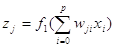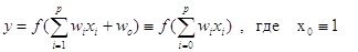 f1(x) –функция активации нейронов скрытого слоя; f2(x) –функция активации нейрона выходного слоя. В качестве функции активации f1(x) для нейронов скрытого слоя и f2(x) для единственного нейрона на выходе сети предлагается использовать одну и ту же функцию, а именно сигмоидную функцию активации, для краткости будем обозначать ее как f(x):