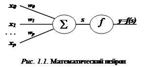 где wi - вес синапса (weight), (i=0,1,2...p); w0 - значение смещения (bias); s - результат суммирования (sum); xi - компонента входного вектора (входной сигнал), (i=1,2,...p); y - выходной сигнал нейрона; p- число входов нейрона; f - нелинейное преобразование (функция активации). В общем случае входной сигнал, весовые коэффициенты и значения смещения могут принимать действительные значения. Выход (y) определяется видом функции активации и может быть как действительным, так и целым. Во многих практических задачах входы, веса и смещения могут принимать лишь некоторые фиксированные значения. Синаптические связи с положительными весами называют возбуждающими, с отрицательными весами - тормозящими. Таким образом, нейрон полностью описывается своими весами wi и передаточной функцией f(x). Получив набор чисел (вектор) xk в качестве входов, нейрон выдает некоторое число y на выходе. Эта модель была предложена Маккалоком и Питтсом еще в 1943 г. При этом использовались пороговые передаточные функции (рис. 2a), и правила формирования выходного сигнала y выглядели особенно просто: