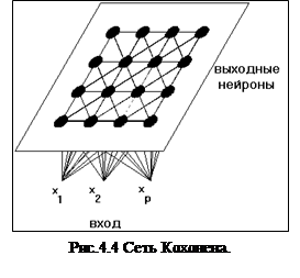 4.2 Сети Кохонена. Сети Кохонена – это одна из разновидностей нейронных сетей, для настройки которой используется алгоритм обучения без учителя. Задачей нейросети Кохонена является построение отображения набора входных векторов высокой размерности на карту кластеров меньшей размерности , причем таким образом, что близким кластерам на карте отвечают близкие друг к другу входные векторы в исходном пространстве. Сеть состоит из M нейронов, образующих, как правило одномерную или двумерную карту (рис. 4.2). Элементы входных сигналов {xi} подаются на входы всех нейронов сети. В процессе функционирования (самоорганизации) на выходе слоя Кохонена формируются кластеры (группа активных нейронов определённой размерности, выход которых отличен от нуля), характеризующие определённые категории входных векторов (группы входных векторов, соответствующие одной входной ситуации). [9]