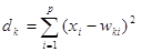Алгоритм Кохонена формирования карт признаков. Шаг 1. Инициализировать веса случайными значениями. Задать размер окрестности s(0), и скорость h(0) и tmax. Шаг 2. Задать значения входных сигналов (x1,…,xp). Шаг 3. Вычислить расстояние до всех нейронов сети. Расстояния dk от входного сигнала x до каждого нейрона k определяется по формуле: