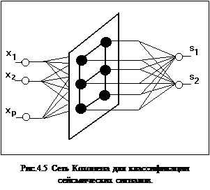 Шаг 6. Обновить размер окрестности s(t) и скорость h(t) s(t)=s(0)(1-t/tmax) h(t)=h(0)(1-t/tmax) Шаг 7. Если (t < tmax), то Шаг 2, иначе СТОП. Благодаря своим способностям к обобщению информации, карты Кохонена являются удобным инструментом для наглядного представления о структуре данных в многомерном входном пространстве, геометрию которого представить практически невозможно. Сети встречного распространения. Еще одна группа технических применений связана с предобработкой данных. Карта Кохонена группирует близкие входные сигналы Х, а требуемая функция Y = G(X) строится на основе обычной нейросети прямого распространения (например многослойного персептрона или линейной звезды Гроссберга[1]) к выходам нейронов Кохонена. Такая гибридная архитектура была предложена Р. Хехт-Нильсеном и имеет название сети встречного распространения[1-3,7,9]. Нейроны слоя Кохонена обучаются без учителя, на основе самоорганизации, а нейроны распознающих слоев адаптируются с учителем итерационными методами. Пример такой структуры для решения задачи классификации сейсмических сигналов приведен на рис. 4.5.