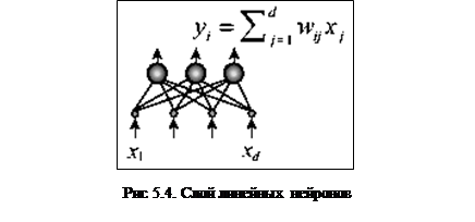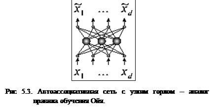 d - количество нейронов на входном ми выходном слоях (размерность вектора признаков); yi - выход с i-го нейрона внутреннего слоя, i=1,…,M M – количество нейронов на внутреннем слое; h - коэффициент обучения; wij=wkj - веса сети , соответственно между входным – скрытым и скрытым – выходным слоями. Скрытый слой такой сети осуществляет оптимальное кодирование входных данных, и содержит максимально возможное при данных ограничениях количество информации. После обучения внешний интерфейс (wij) (рис.5.4) может быть сохранен и использован для понижения размерности.