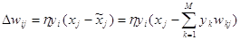 Чтобы восстановить свои входные данные, сеть должна научиться представлять их в более низкой размерности. Базовый алгоритм обучения в этом случае носит название правило обучения Ойя для однослойной сети. Учитывая то, что в такой структуре веса с одинаковыми индексами в обоих слоях одинаковы, дельта-правило обучения верхнего (а тем самым и нижнего) слоя можно записать в виде: