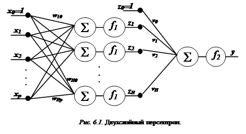 вызвала процедура расчета градиента функции ошибки Разберем этот метод на примере двухслойного персептрона с одним нейроном на выходе.(рис 6.1) Для этого воспользуемся введенными ранее обозначениями. Итак,