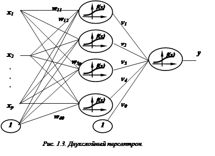 Нейронная сеть. Нейронная сеть — это набор нейронов, определенным образом связанных между собой. Как правило, передаточные функции всех нейронов в сети фиксированы, а веса являются параметрами сети и могут изменяться. Одними из наиболее распространенных являются многослойные сети, в которых нейроны объединены в слои. Слой - это совокупность нейронов c единым входным сигналом. В качестве основного примера рассмотрим сеть, которая достаточно проста по структуре и в то же время широко используется для решения прикладных задач — двухслойный персептрон с p входами и одним выходом (рис. 2.3).