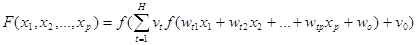 Как следует из названия, эта сеть состоит из двух слоев. Собственно нейроны располагаются в первом (скрытом) и во втором (выходном) слое. Входной слой (также его называют нулевым или «вырожденным») только передает входные сигналы ко всем H нейронам первого слоя (здесь H = 4). Каждый нейрон первого слоя имеет p входов, которым приписаны веса wi0,wi1,wi2, ..., wip (для нейрона с номером i). Веса wi0 и v0 соответствуют смещению b в описании формального нейрона, которое приведено выше. Получив входные сигналы, нейрон суммирует их с соответствующими весами, затем применяет к этой сумме передаточную функцию и пересылает результат на один из входов нейрона второго («выходного») слоя. В свою очередь, нейрон выходного слоя суммирует полученные от первого слоя сигналы с некоторыми весами vi. Итак, подавая на входы персептрона любые числа x1, x2, ..., xp, мы получим на выходе значение некоторой функции F(x1, x2, ..., xp), которое является ответом (реакцией) сети. Очевидно, что ответ сети зависит как от входного сигнала, так и от значений ее весовых коэффициентов. Выпишем точный вид этой функции