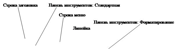 Общий вид окна MS Word 97 Первая строка основного окна, являющаяся строкой заголовка, содержит название пакета – Microsoft Word. Строка меню, начинающаяся со слова “Файл”, содержит названия главных режимов меню, каждый из которых в свою очередь раскрывается в список команд. При активизации кнопок, идет выполнение наиболее часто используемых операций, в том числе некоторых команд форматирования, печать документа и просмотр подготовленного к печати документа на экране. По умолчанию при создании нового документа панель инструментов всегда изображается на экране, но при желании панель инструментов можно убрать с экрана. На экране можно отразить ту или иную панель в зависимости от потребности потребителя. Ниже панели инструментов располагается окно документа. В строке Заголовок документа выводится имя документа, точнее, имя файла, в котором он находится. По умолчанию новым документам присваиваются имена Документ N, где N — порядковый номер нового документа. При дальнейшей работе имена документов можно изменить. Следующая строка называется линейкой. Эта строка позволяет увидеть и изменить положение отступов и табуляторов для текущего абзаца текста. Ниже линейки форматирования располагается рабочая зона, в которую вводятся текст, формулы, иллюстрации и другие объекты документа. Предпоследняя строка экрана содержит линейку горизонтальной прокрутки. Она позволяет просматривать правую часть широкого документа, не поместившуюся в окне. Перемещение окна по горизонтали вдоль страницы документа осуществляется с помощью кнопок со стрелками и движка. Справа от этой линейки в той же строке экрана расположены кнопки для перелистывания страниц большого документа в обе стороны и установки первой или последней страницы. В правой части экрана расположена линейка вертикальной прокрутки для просмотра длинных документов. Над кнопкой перемещения вверх линейки вертикальной прокрутки располагается маркер-делитель окна. Маркер позволяет разделить окно по горизонтали на две области и вывести в каждую из них различные части одного и того же документа, при этом каждая область экрана будет иметь свои линейки прокрутки. Маркер работает, если текст выведен в обычном или черновом режимах. Для разделения окна необходимо «зацепить» маркер мышью и «протащить» его вниз в нужную позицию экрана. В последнюю строку экрана – строку состояния выводится вспомогательная информация об активном документе (номер текущей страницы и их общее количество), более подробные сведения о текущем пункте меню, а также названия включенных клавиш управления (NUM Lock, Сарs Lock). 4 Основные приемы работы с документамиДля запуска необходимо щелкнуть по пиктограмме данного приложения. Сразу после запуска на экране откроется окно с пустым документом. Как правило, оно развернуто на полный экран, а вторичное окно документа слито с основным. При создании нового документа в Word вы видите пустое окно для ввода. Вертикальная черта (курсор) расположена в верхнем левом углу окна. Ниже курсора располагается горизонтальная черта, которая называется маркером конца документа. При вводе текста символы появляются на экране слева от точки вставки, которая смещается вправо по мере ввода текста. Нажимать клавишу Enter нужно, только чтобы отметить конец абзаца или вставить пустую строку. При нажати