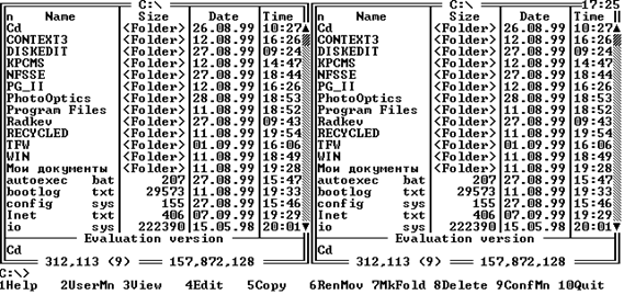 Для запуска Norton Commander необходимо набрать в командной строке “nc” и нажать “Enter” (ввод). Выход из Norton Commander – клавиша F10 или ALT+X Вид экрана и панелейПосле запуска Norton Commander на экране появляются два прямоугольных окна (панели).