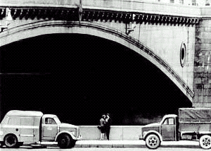 Автор снимка 44,а скомпоновал его строго симметрично, но потом отказался от такого линейного рисунка, нарушил симметрию, введя в композицию асимметричный элемент - арку моста (см. фото 44,б). Центральная вертикальная ось арки сдвинута от центра влево, справа показалась мощная опора моста. И классическая симметрия уступила место более живой, асимметричной композиции. Возникло иное соотношение частей картины, исчезло их тождество, и это дает новый изобразительный эффект. Композиция фото 44,а замкнута - основные линии в кадре направлены к его центру. на фото 44,б она разомкнута - активная линия арки и линия парапета моста в верхней части снимка уходят за рамку кадра и продолжаются за пределами снимка. Такой композиционный строй прочнее связывает кадр с обстановкой, с реальной средой. Более того, возникает мысль, что для дальнейшего развития темы пространство на изображении могло быть взято еще несколько шире. Было бы полезно сделать более активным элементом композиции шумную, людную улицу, которая находится здесь же, совсем рядом, и сейчас только намечена беглым штрихом в правом верхнем углу кадра. Но и без этого линейный строй фото 44,б несомненно обогащен по сравнению с первым вариантом композиции, а тема в такой изобразительной трактовке получает значительно более яркое выражение.