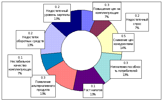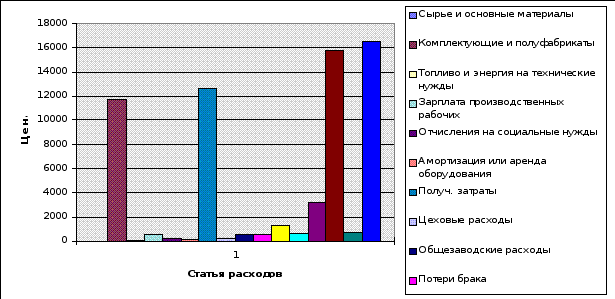 По результатам видно, что наибольшую опасность представляют риски: 1) Повышение цен на комплектующие 2) Недостаточный спрос 3) Нестабильное качество комплектующих Главная мера по борьбе с 1 риском - расширение спектра фирм-поставщиков. По оценкам экспертов средние вероятности риска 1 при увеличении числа поставщиков в 2 раза составит 0.1. Однако при этом произойдет увеличение средней вероятности реализации риска 3 до 0.15.. Для борьбы с риском 2 необходимо произвести широкую рекламную кампанию в СМИ и тем самым уменьшить вероятность его реализации, по оценкам, до 0.15. Мера для борьбы с риском 3 - более тщательный выбор поставщиков. При его реализации нужно ограничить их круг надежными фирмами, хотя это и повысит вероятность риска 1. 6. Расчет себестоимости единицы продукции. Таблица 2.1. Расчет себестоимости единицы продукта.