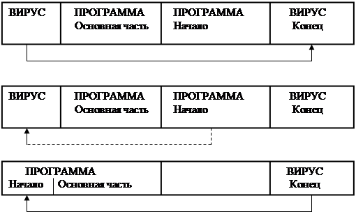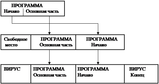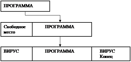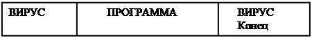 Тело вируса записывается в начало файла, а часть вируса, обеспечивающая восстановление программы – в конец рис. 3