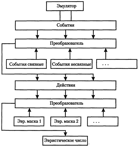 Таким образом, в ячейку массива Events записывается порядковый номер для выявленного события. CountEvents при инициализации равен 0. После того, как эмулятор завершит свою работу, последовательно запускаются два преобразователя. Первый преобразователь заполняет массив действия, выбирая данные из массива событий и цепочек связных и несвязных событий по следующему алгоритму: for(i=0;i<CountMaskEvrnrs;i++) { if (MaskEvents[i][0]= =0) { for(j=2;j<MaskEvents[i][1];j++{ if(Events[MaskEvents[i][j]]= =0) goto nextMask; } else for(e=0, j=2;j<MaskEvenfs[l][1];j++) { if(Events[MaskEvents[i][j]]==0 II Events[MaskEvents[i][j]]<e) goto nextMask; else e=Events[MaskEyents[i][j]]; } Actions[i]=1; nextMask:; } где: CountMaskEvents - число масок цепочек событий; MaskEvents - двумерный массив цепочек связных и несвязных событий; Actions - массив действия. Затем выполняется второй преобразователь, который выбирает данные из массива действия и цепочек эвристических масок и вычисляет эвристическое число по следующему алгоритму: for(i=0;i<CountMaskHeurist;i++) { for(j=1;j<MaskHeurist[i][0];j++) if(Actions[MaskHeurist[i][j]]= =0) goto nextMask1; NumberHeurist=i+1; break; nextMask1: } где: CountMaskHeurist - число эвристических масок; MaskHeurist - двумерный массив с эвристическими масками; NumberHeurist - эвристическое число. |