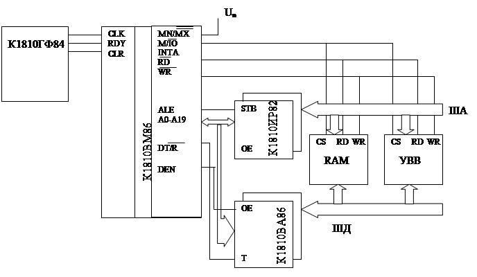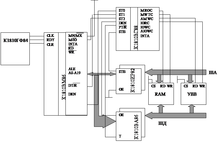 При суммировании может возникать перенос из разряда A19 в A20. Этот перенос игнорируется. Аналогичную кольцевую организацию имеет каждый сегмент. При выборке команда: CS +IP = ФА команды. При обращении к стеку: SS +SP =ФА стека. Обращение к данным может производиться из любого сегментного регистра: DS (SS,CS,ES) +EA = ФА данных. EA – эффективный адрес, константа, указанная в программе. К данным можно обратиться через индексные регистры SI и DI; причем индексный регистр хранит смещение на адрес ячейки памяти, откуда данные можно извлечь. А DI хранит смещение на адрес ячейки памяти, куда данные можно направить: DS(SS,CS,ES) +SI=ФА данных; ES+DI =ФА данных. Обращение через регистр BX: ES(CS,SS,DS)+BX= ФА данных. Такая модульная организация памяти посегментно позволяет писать программы в виде отдельных модулей. Структурная схема на основе К1810. При организации вычислительной машины нужно решить следующие задачи: 1) разделить адресные сигналы и сигналы данных; 2) сформировать необходимые управляющие сигналы. Первая задача решается с помощью буферных регистров К1810ИР82 и шинных формирователей К1810ВА86(87). Вторая задача несколько сложнее и зависит от сложности решаемых задач разрабатываемой микропроцессорной системы. Сложность задачи определяет нужные объемы памяти и количество устройств ввода / вывода. Поэтому МП К1810ВМ86 может работать в двух режимах: минимальный и максимальный. Минимальный позволяет организовывать вычислительные и управляющие системы, имеющие ограниченные объемы памяти и малое количество внешних устройств.
