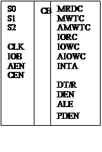 Функционирование микросхемы осуществляется на основании следующего кода: CLK –подключение системного генератора AEN – строб управления выдачи командных сигналов контроллера (используется в случаях обращения к резидентной шине в/в.) СEN – сигнал управления при каскадировании ВГ88 IOB - признак обращения к системной шине («0» -системная шина, «1» - резидентная шина) MRDC – системный сигнал чтения из памяти MWTC – системный сигнал записи в память AMWC – опережающий строб при обращении к памяти IORC – системный сигнал ввода IOWC – системный сигнал вывода AIOWC – опережающий строб INTA – системный сигнал подтверждения прерывания DEN - строб сопровождения данных для фиксации в регистры-защелки ALE – строб сопровождения адреса в регистр-защелку OT/R – сигнал определяющий направление передачи информации («0» -запись в память; «1»- считывание) STB – сигнал стробирования адреса PDEN – используется при каскадировании контроллеров системной шины в микропроцессорные вычислительные системы. Функциональная схема включения.