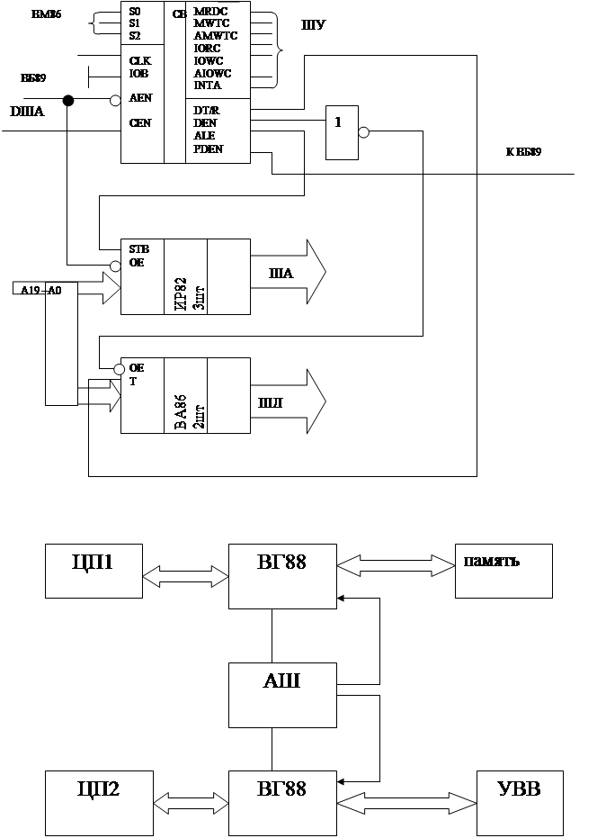 CLK – вход для подключения системного генератора. LOCK – вход запрета освобождения системной шины: «1» - арбитру запрещается освобождать системную шину, не зависимо от его приоритета. CRQLCR - выход запрета освобождения системной шины если поступил запрос по входу CBRQ. ANYRQST – вход разрешения освобождения системной шины. RESB – выбор режима работы системной либо резидентной шины («1» - системная шина; «0» - резидентная шина) IOB – выбор режима работы при вводе / выводе информации через системную либо резидентную шину («1» - системная шина; «0» - резидентная шина) AEN – сигнал разрешения доступа к системной шине. BCLK – сигнал синхронизации системной шины. BREQ – сигнал запроса системной шины. BPRN – вход разрешения приоритетного доступа к системной шине BPRQ – выход приоритетного доступа к системной шине. BUSY – сигнал занятости шины. CBRQ – вх/вых общего запроса шин.