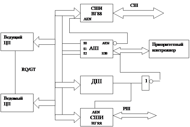 При последовательном разрешении приоритетов веса арбитров задаются подключением BPRN с BPRQ. Для схемы, изображенной на рисунке максимальный приоритет будет иметь 1-й АШ, а минимальный – 3-й. Схема параллельного разрешения приоритетов предполагает использование дополнительного приоритетного контроллера . В простейшем случае при аппаратном задании весов приоритетов, приоритетный контроллер представляет собой схему, выполненную на логических элементах. Более сложные приоритеты устанавливаются программным путем.