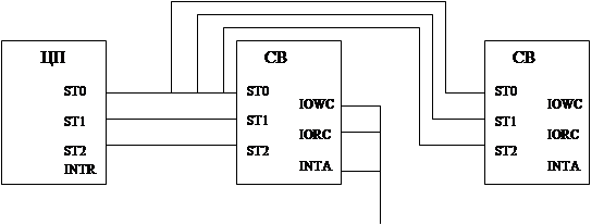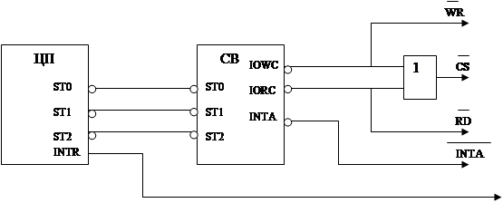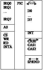 IRQ0-IRQ7 – запросы на прерывания. Если программируемым путем не произведено перераспределение приоритетов, то IRQ – маскируемый приоритет. A0 – адрессный вход для подключения младшей линии адреса. СS – выбор микросхемы. WR – запись информации в микросхему. RD – чтение. INTA – подтверждение прерывания. D0–D7 – входы данных (для программирования микросхемы). Подключаются к младшему байту шины данных. INT – вход прерывания. CAS0-CAS2 – входы для каскадирования микросхем. Микросхема может работать в режимах программирования и режиме обслуживания переферии. Режим программирования задается CS=0. Схема подключения контроллера к системной шине.