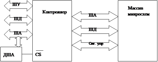 ДША – предусматривается для каждого блока памяти. Контроллер: К1810ВТ02 (ВТ03). Совместно с микропроцессором используются микросхемы динамической ОЗУ серии К565. Запись информации в микросхемы ОЗУ выполняется в соответствии со следующей диаграммой: 1-й такт – записывается код адреса строки, которая стробируется сигналом RAS, во втором такте записывается код адреса столбца сигналом CAS, а также происходит процедура записи/чтения R/W. Такая двухсторонняя процедура записи информации экономит адресные выходы микросхем ОЗУ. Мультиплексирование адресных линий и двухступенчатая процедура обмена позволила сэкономить количество выводов на микросхемах ОЗУ. Способы дешифрации адреса. Способ дешифрации адреса зависит от объемов ОЗУ и ПЗУ, количества и типа устройств ввода/вывода. При проектировании микропроцессорной системы используются следующие способы дешифрации адреса: 1) линейный выбор. Самый простой способ, не использующий логику дешифрации адреса. Технически реализуется следующим образом: любая линия ША используется как сигнал выборки кристаллов. Пример реализации:
