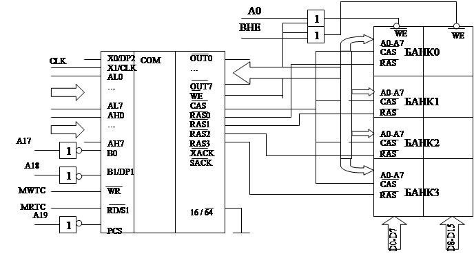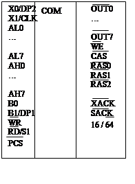 WR,RD/S1 – сигналы системной записи/чтения. B0,B1 – входы дешифратора (выборка банков памяти). PCS – вход выборки кристалла контроллера. OUT0-OUT7 – мультиплексированные выходы выбора адрессов строк и столбцов. WE – сигнал считывания памяти. CAS – RAS2 – сигналы управления микросхемами динамической памяти. XACK – ответ памяти на сигналы обращения к ней. SACK – готовность памяти. Пример подключения управления динамической памятью объемом 512 Кбайт показан на рисунке: