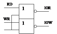 1) прямая адрессация, в этом случае код адресса порта указывается во втором байте комманды. Этот вид адрессации обеспечивает обращение к 256 портам в/в; 2) косвенная адрессация, в этом случае вовтором байте комманды указывается регистр DX и поскольку он 16-ти разрядный, то можно организовать 65536 внешних устройств. При такой адрессации в/в под адрессацию портов отводится один сегмент памяти. При втором способе адрессации внешние устройства находятся в общем адрессном пространстве с памятью. Поэтому в этом случае обращение к ним может быть выполнено как к обычным ячейкам памяти. Длявыполнения операций в/в кроме комманд IN и OUT могут быть использованы любые комманды пересылки. Второй способ имеет большие функциональные возможности. В нем может быть организована с помощью специальных комманд пересылка данных междк ЦП и внешними устройствами, между внешними умтройствами и памятью. Колличество подключаемых внешних устройств до 1Мб. В прстейшем случае в минимальном режиме для обращения к внешним устройствам могут быть использованы системные сигналы MEMR, MEMW, которые получаются из сигналов МП WR и RD: