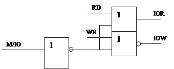 Обмен информацией с внешними устройствами. 1) организация ввода/вывода. Обмен информацией между микропрцессором и внешними устройствами выполняется 2-мя способами: использование адресного пространства в/в; использование общего с памятью адрессного пространства. Техническая реализация 1-го способа предусматривает разделение всей области адресного пространства на память и адреса внешних устройств. Обмен данными между микропрцессором и внешними устройствами выполняется по коммандам IN и OUT. Для аппаратной идентификации адрессного пространства в/в используется сигнал M/IO=0. При работе микропроцессора в минимальном режиме системные сигналы управления вводом/выводом могут быть получены с помощью логических элементов: