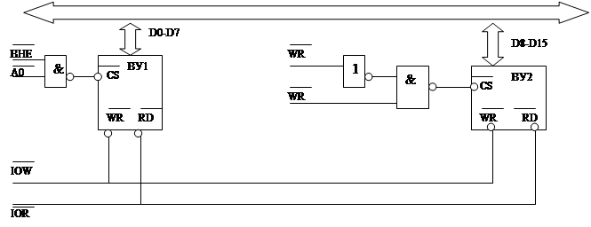 При обмене данными МП передает по ШД либо все слово (16 бит), либо младший байт. Чтобы байт был передан за один цикл системной синхронизации нужно, чтобы адресс внешнего устройства был четным. Также внешние устройства должны подключаться к младшему байту ШД. Для идентификации раздельного подключения внешних устройств к младшему либо старшему байту данных используются сигналы А0 и BHE. Состояние этих сигналов указано в таблице(см.ВМ86). Подключение внешних устройств к системной магистрали. При подключении внешних устройств возникает проблема согласования 8-ми битной ШД внешнего устройства с 16-ти битной ШД микропроцессора. Данная задача решается 2-мя способами: 1) внешнее устройство подключается либо к старшему, либо к младшему байту ШД. Для идентификации внешнего устройства (CS) используются сигналы A0 и BHE.