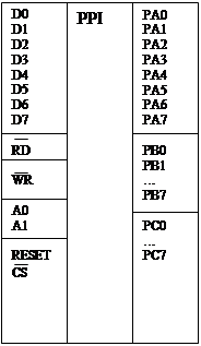 Эта схема включения работает в режиме в/в с отображением на память. Передаваемая и принимаемая информация может распределяться как по четным, иак и по нечетным адресам. Длинна пересылки данных определяют сигналы А0 и BHE. Программируемый парралельный интерфейс. Микросхемы данного типа не входят в состав конкретных микропроцессор-ных комплектов. 8225