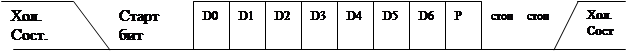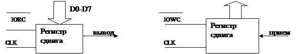 - весь порт работает на вывод информации - весь порт работает на ввод информации - отдельные на ввод, отдельные на вывод. Назначене линий : D0-D7 - входы для подключения к резидентной или системной шине. A0,A1 - входы выбора порта По скольку архитектура центрального процессора 16-ти разрядная, а микросхема порта 8-ми разрядная возможны 2 варианта подключения данной микросхемы. При передаче 8-ми разрядных данных интерфейс подключается к младшему байту шины данных, а центральный процессор программируется на вывод этого байта. Для передачи всего слова нужно использовать 2 контроллера. Программируемый последовательный интерфейс. Последовательный обмен данных регламентируется в стандарте RS232C. Этот стандарт предусматривает для передачи информации 3 линии связи: общая, линия передачи (ВА) и линия приема (ВВ). Протокол обмена данными имеет следующий формат: Функционально последовательный интерфейс реализуется на 2-х сдвигающих регистрах: Последовательный интерфейс может работать в синхронном и асинхронном режиме. Синхронный режим подразумевает работу интерфейса приемника и передатчика под управлением системного генератора.