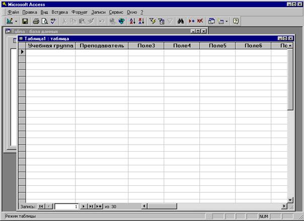 Щелкнем мышкой по кнопке Создать. Появится окно, представленное на рис.1. Рисунок 1. · Оставим Режим таблицы и щелкнем по кнопке ОК. Появится пустая таблица, поля которой не определены и не имеют названия. Тип поля будет выбран автоматически в зависимости от введенной информации. · Переименуем Поле 1. Для этого поставим курсор в любую ячейку столбца Поля 1. Выполним команду Формат – Переименовать столбец. Ячейка имени столбца окажется выделенной. Введем название поля Учебная группа и нажмем клавишу Enter. · Переименуйте Поле 2. Для этого поставим курсор в любую ячейку столбца Поле 2. Выполним команду Формат – Переименовать столбец. Ячейка имени столбца окажется выделенной. Введем название поля Преподаватель и нажмем клавишу Enter. Рисунок 2.