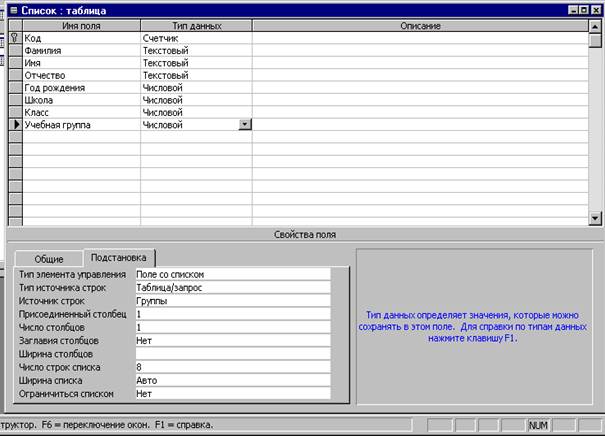 · Сохраним таблицу с именем Список, щелкнув по кнопке Сохранить. На вопрос о создании ключевого поля ответим отрицательно. · Перейдем в режим Конструктор и посмотрим, как заданы поля. Сделаем поле Код ключевым, поместив курсор на имя этого поля и нажав кнопку – Ключевое поле. Тип поля Код – счетчик, полей Фамилия, Имя, Отчество – текстовые, полей Год рождения, Школа, Класс, Учебная группа – числовые. С полем Учебная группа разговор особый. Его тип – числовой. Общие свойства поля не меняем. Кроме того, значение этого поля надо не набивать в ручную, а выбирать из списка, содержащегося в таблице Группы. Для этого в свойствах поля следует указать, что здесь имеет место подстановка по следующей схеме: выберем вкладку Подстановка, тип элемента управления – Поле со списком, источник строк – Группы. Получим значения элементов, как показано на рисунке 3.