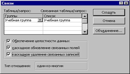ставленное на рисунке 4. Рисунок 4. · Включим значок Обеспечение целостности данных. Это невозможно будет сделать, если типы обоих полей заданы не одинаково. · Включим значок Каскадное обновление связанных полей. Это приведет к тому, что при изменении номера группы в таблице Группы автоматически изменится соответствующий номер в таблице Список. · Включим значок Каскадное удаление связанных полей. Это приведет к тому, что при удалении записи с номером группы в таблице Группы будут удалены все записи из таблицы Список, в которой стояли соответствующие номера групп. ·