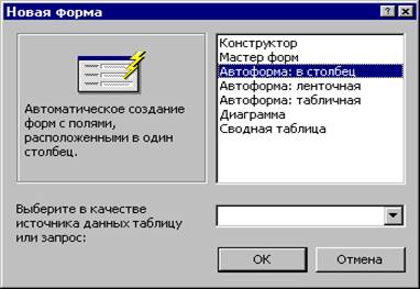 Появится диалоговое окно (рис.6), в котором следует выбрать Автоформа в столбец, а в качестве источника данных – Список. Рисунок 6 · Щелкнем по кнопке ОК. Появится пустая форма ввода, представленная на рис.7.