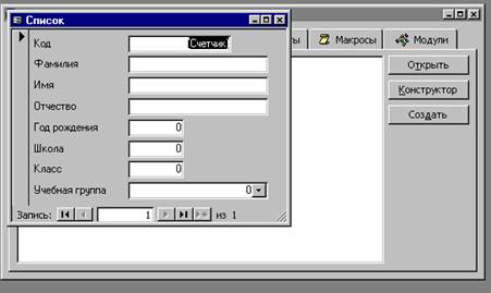 · Сохранить введенные данные. Имя формы – Список. Закрыть форму. · Перейти в окно Таблицы. Открыть таблицу Список. · Убедимся, что в таблице появились новые записи. · Щелкнув по кнопке Сохранить, сохраним текущую таблицу. · Щелкнув по нижней кнопке Закрыть в правом верхнем углу, закроем таблицу. ИСПОЛЬЗУЕМАЯ ЛИТЕРАТУРА: 1. Информатика (теория) под редакцией профессора Макаровой Н.В. Москва «Финансы и статистика» 2000г. 2. Информатика (практикум) под редакцией профессора Макаровой Н.В. Москва «Финансы и статистика» 2000г. 3. Практикум по Access. Золотова С.И. Москва «Финансы и статистика» 2000г. |