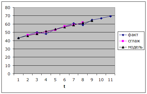Расчетное значение RS-критерия равное 2,9 попадает внутрь [2,7-3,7], т.о. гипотеза о соответствии распределения остаточной компоненты нормальному закону распределения принимается. г) Для оценки точности модели используйте среднее квадратическое отклонение и среднюю ошибку по модулю. Т.к. модель неадекватна, то нет смысла говорить о ее точности. 6. Постройте точечный и интервальный прогнозы на два шага вперед. Точечный прогноз на K шагов вперед получается