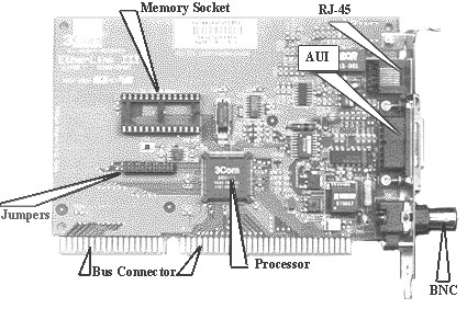 Рис. 9.33 Вид адаптера Базовый, или физический, адресНекоторые сетевые адаптеры имеют возможность использовать оперативную память ПК в качестве буфера для хранения входящих и исходящих пакетов данных. Базовый адрес (Base Memory Address) представляет собой шестнадцатеричное число, которое указывает на адрес в оперативной памяти, где находится этот буфер. Важно выбрать базовый адрес без конфликтов с другими устройствами. Типы сетевых адаптеровСетевые адаптеры различаются по типу и разрядности используемой в компьютере внутренней шины данных – ISA, EISA, PCI, MCA. Сетевые адаптеры различаются также по типу принятой в сети сетевой технологии – Ethernet, Token Ring, FDDI и т.п. Как правило, конкретная модель сетевого адаптера работает по определенной сетевой технологии (например, Ethernet). В связи с тем, что для каждой технологии сейчас имеется возможность использования различных сред передачи данных (тот же Ethernet поддерживает коаксиальный кабель, неэкранированную витую пару и оптоволоконный кабель), сетевой адаптер может поддерживать как одну, так и одновременно несколько сред. В случае, когда сетевой адаптер поддерживает только одну среду передачи данных, а необходимо использовать другую, применяются трансиверы и конверторы. Различные типы сетевых адаптеров отличаются не только методами доступа к среде и протоколами, но еще и следующими параметрами: