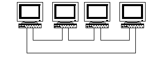 Рис. 1.4 Одноранговая архитектура Одноранговые ЛВС являются наиболее легким и дешевым типом сетей для установки. Они на компьютере требуют, кроме сетевой карты и сетевого носителя, только операционной системы Windows 95 или Windows for Workgroups. При соединении компьютеров, пользователи могут предоставлять ресурсы и информацию в совместное пользование. Одноранговые сети имеют следующие преимущества: